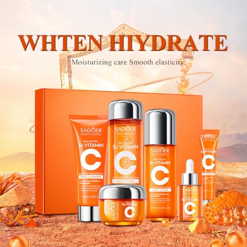 【Intense Nourishment】: Our 6-Piece Vitamin C Skin Care Set is infused with 5 heavy vitamin C, providing intense nourishment to your skin. Experience the power of vitamin C as it repairs dull and injured skin, leaving it refreshed and revitalized.【Complete Skin Care Routine】: This comprehensive set includes a nourishing face toner, serum, cream, lotion,eye cream and cleanser, all infused with 5 heavy vitamin C. Each product works synergistically to improve skin tone, softness, and overall vitality, giving you a complete skincare routine in one convenient package.【Deep Hydration】: Pamper your skin with our nourishing face cream and lotion. Infused with 5 heavy vitamin C, these products effectively nourish and moisturize your skin, leaving it hydrated, supple, and radiant. Say goodbye to dry and dull skin and embrace a healthier, more hydrated complexion.【Revitalize and Refine】: Our nourishing face toner and serum are formulated to revitalize your skin and improve its texture. With the power of 5 heavy vitamin C, these products help repair dullness, soften the skin, and refine your complexion. Experience improved skin tone and a more refined appearance.【Gentle and Effective Cleansing】: Cleanse and nourish your skin with our face cleanser. Enriched with 5 heavy vitamin C, this gentle formula effectively removes impurities while maintaining the skin's natural moisture balance. Say hello to clean, nourished, and refreshed skin.