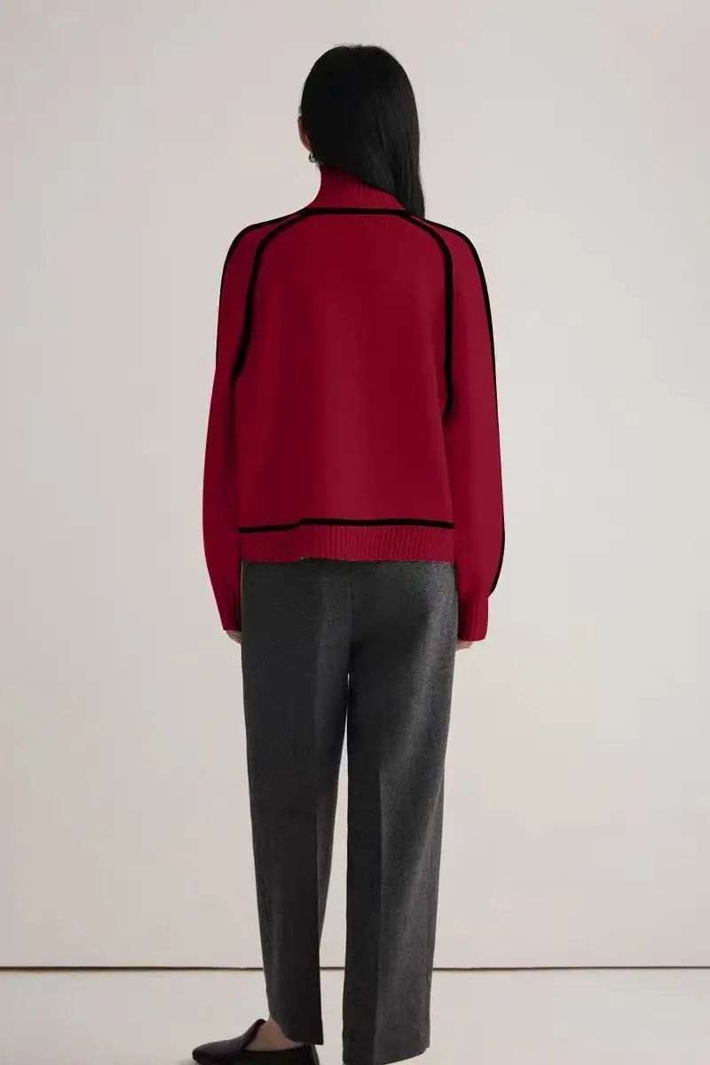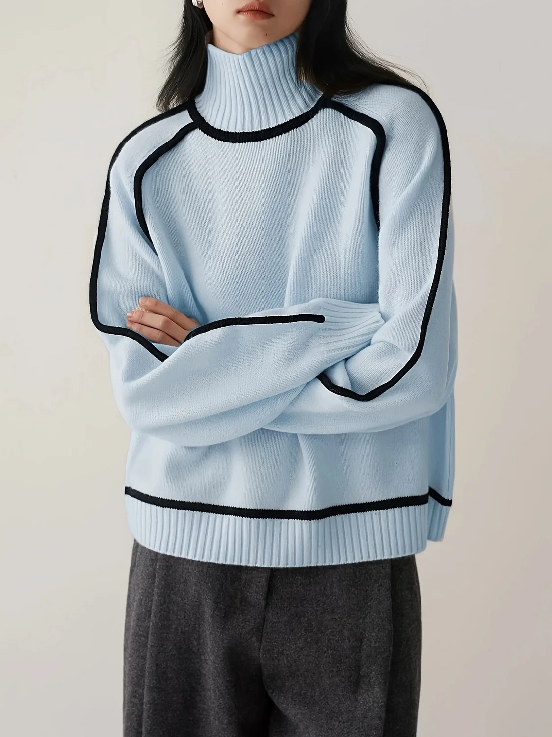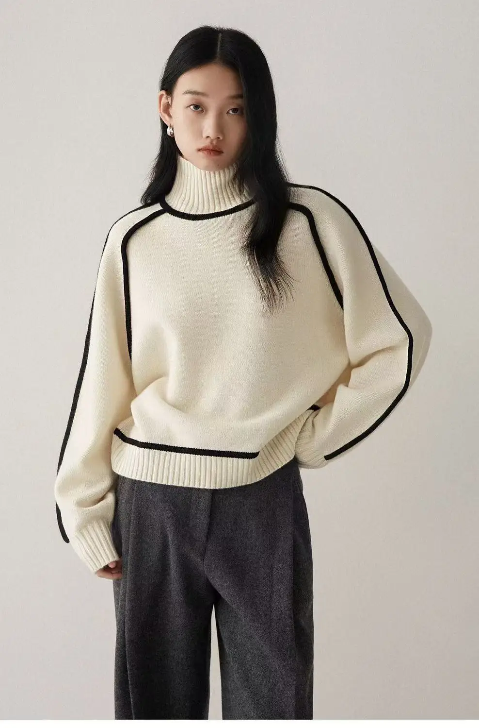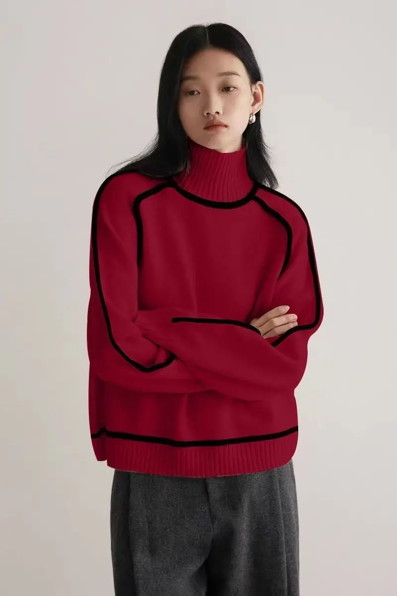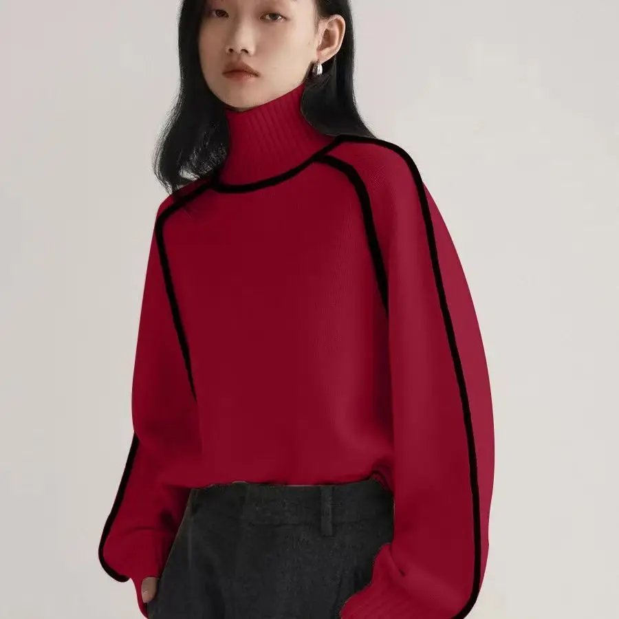 Winter High Neck Raglan Lantern Sleeve Women's French-Inspired Design Soft Loose-Fit Warm Knit Top