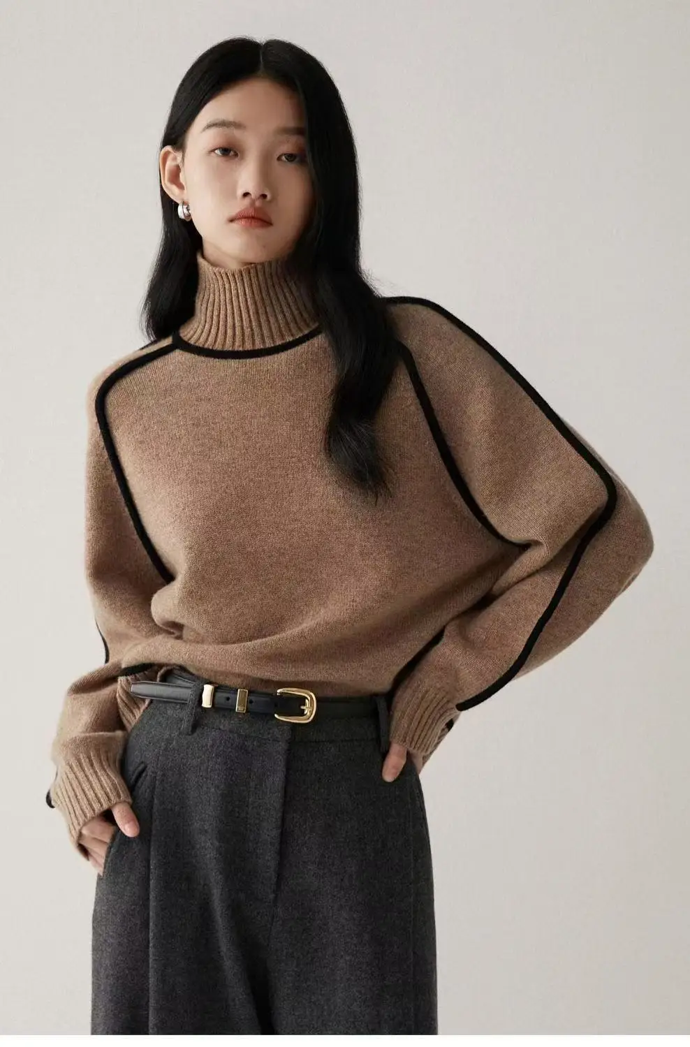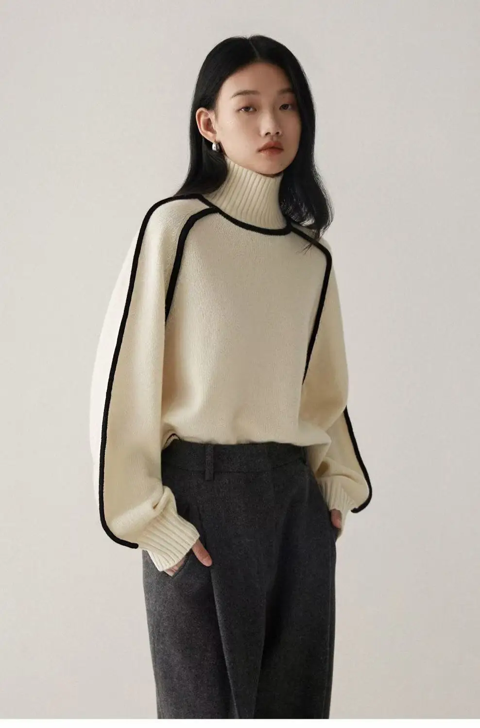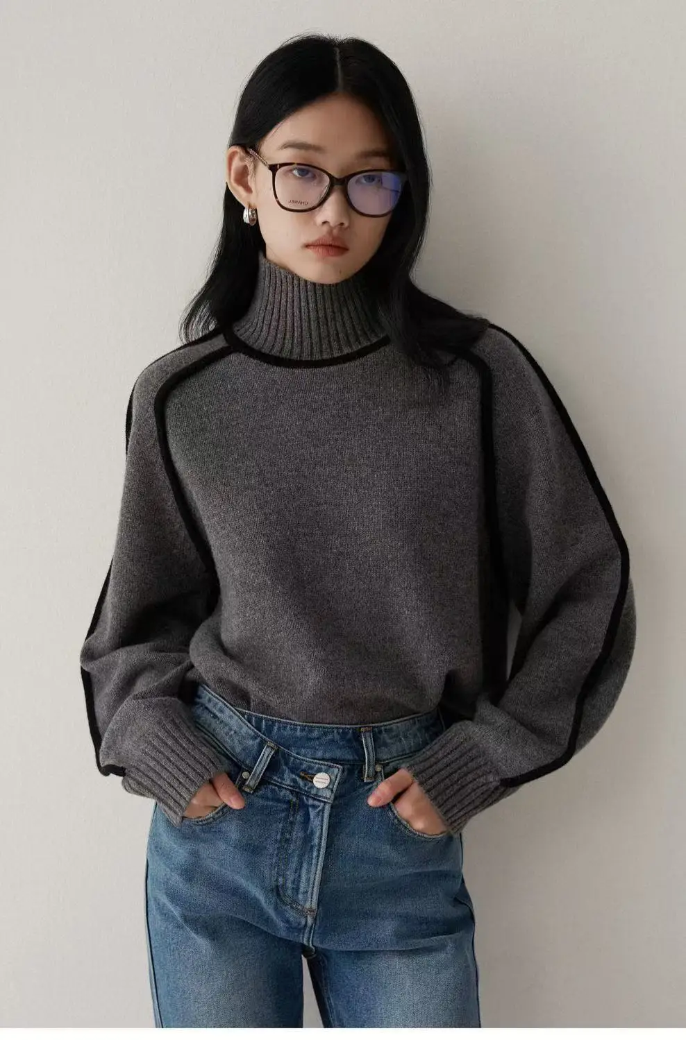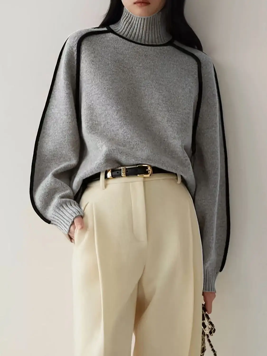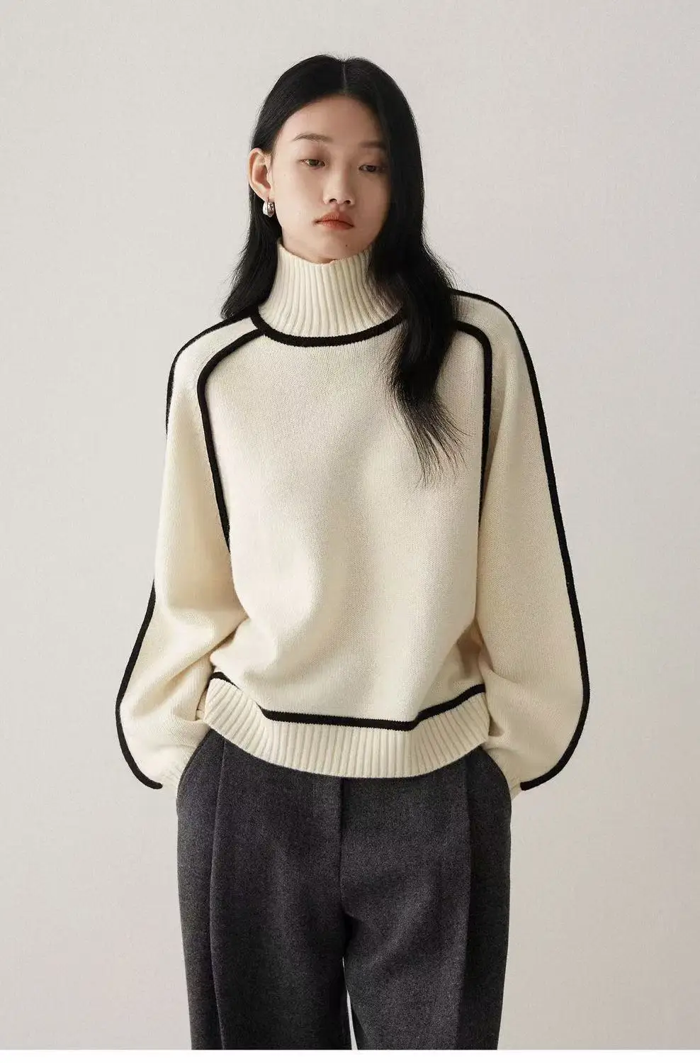 Winter High Neck Raglan Lantern Sleeve Women's French-Inspired Design Soft Loose-Fit Warm Knit Top
