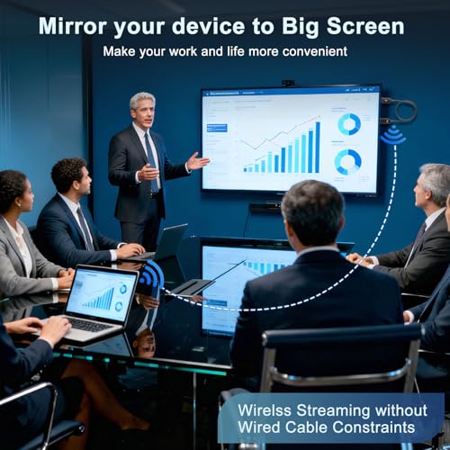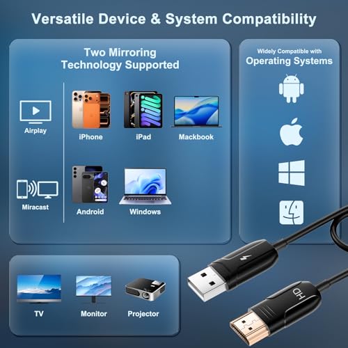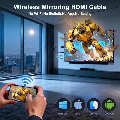 【Wireless HDMI Mirroiring Cable】The Wireless Display Adapter supports Miracast and AirPlay, you can easily stream HD videos, photos, and presentations from your laptop, smartphone, or tablet right to your TV or projector.Experience freedom from cables and enjoy the convenience of instant screen sharing.【High-Definition Screen Sharing】Elevate your viewing experience with our Wireless HDMI cable .Mirror what's displayed on your iPhone or iPad screen, including images, movies, games, apps, presentations, websites, slide shows, and more, on your HDMI-equipped TV, display, projector, or other compatible screens. Enjoy stunning visuals with crystal-clear clarity.【Compact & Portable Cable Design】Perfect for travel,meeting,creative work,home use,Enjoy wireless display your phone,tablet, or laptop to the big screen,Experience smooth,vibrant visuals whether you're watching movies, gaming, or delivering a business presentation.【Plug and Play Low Latency】HDMI Wireless Cable featuring an advanced dual-band chip (5G + 2.4G) and the Dynamic Stability Equalizer Engine, this system delivers strong anti-interference performance and stable signal transmission under all conditions.No apps, no Bluetooth, no Wifi required, one-click to mirror the screen of mobile phones or laptops to a big screen【Wide System Compatibility】This Wireless HDMI Cable supports Airplay for Apple iOS and macOS systems and Miracast for Android and Windows systems,Enjoy high-quality wireless HDMI connectivity across devices like PCs, laptops, projectors, monitors, and HDTVs—wherever you go.