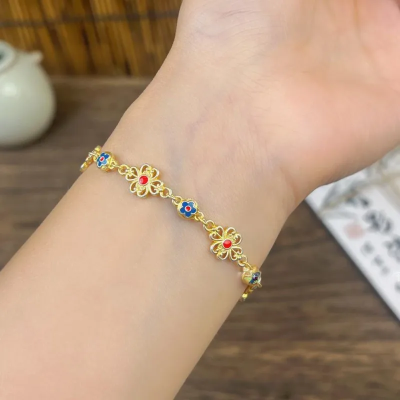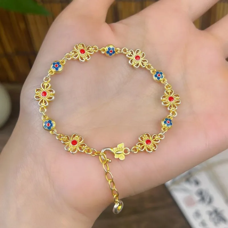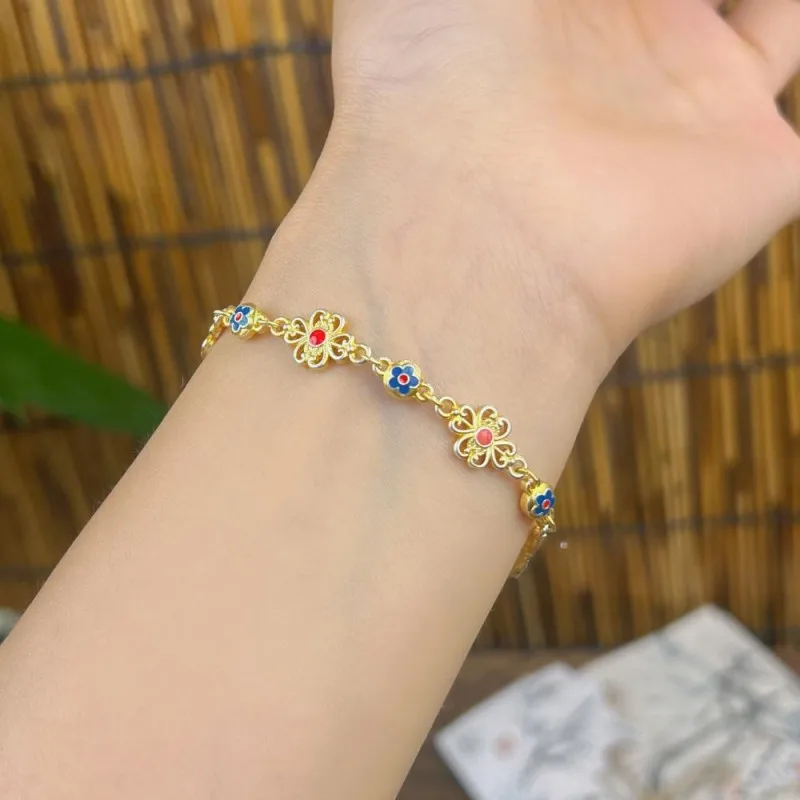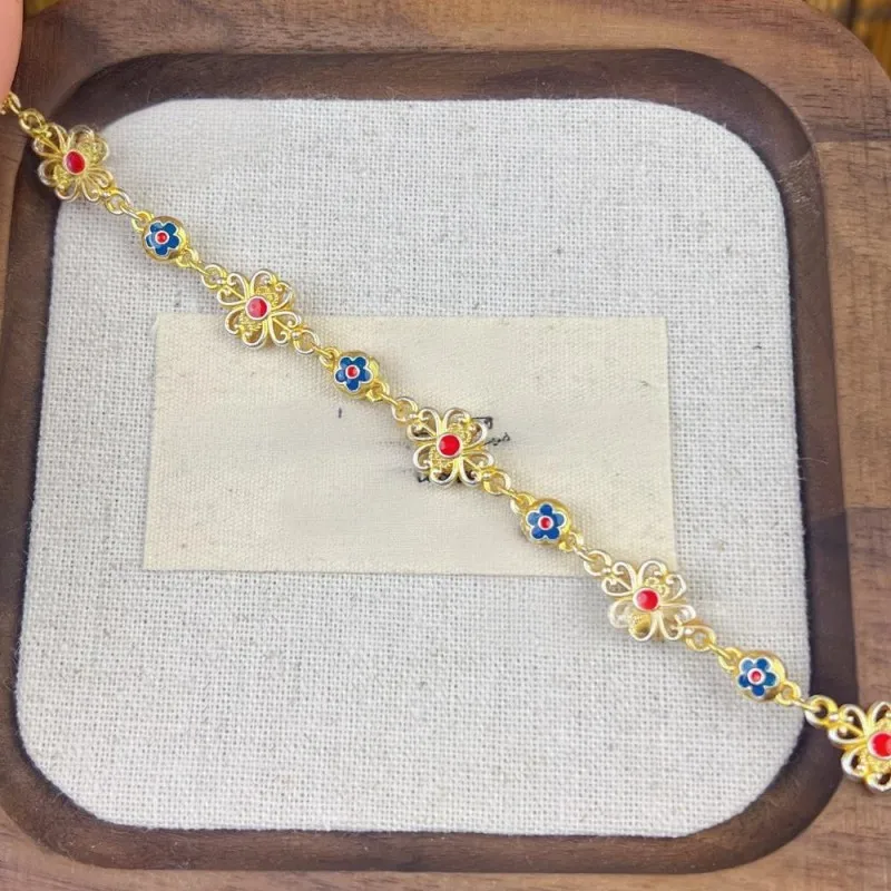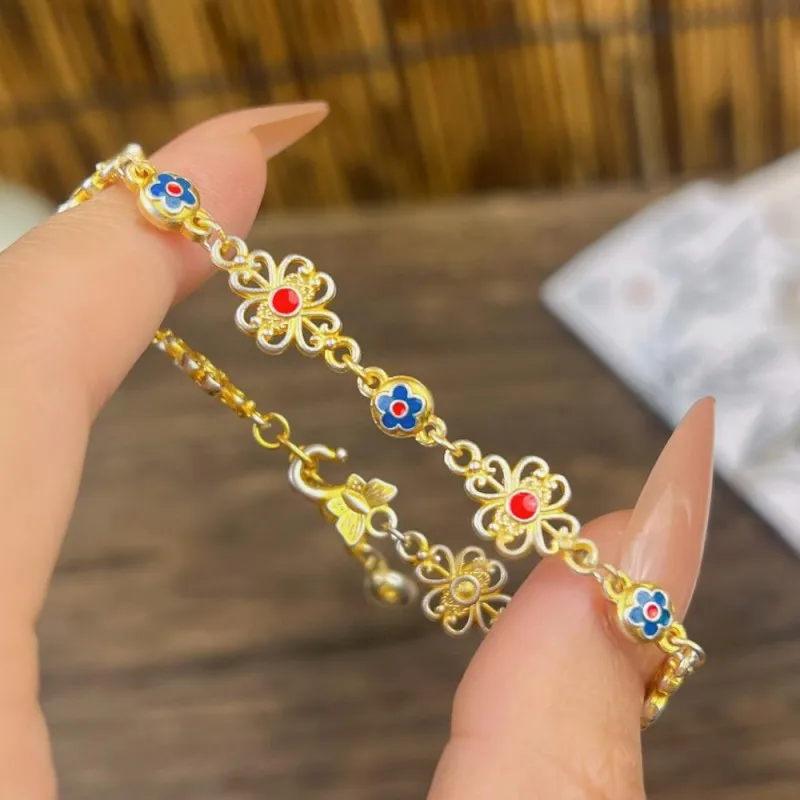 Women 999 Sterling Silver Bracelet Enamel Flower Retro Chinese Style Fashion Adjustable Ladies Bracelets Elegant Fine Jewelry