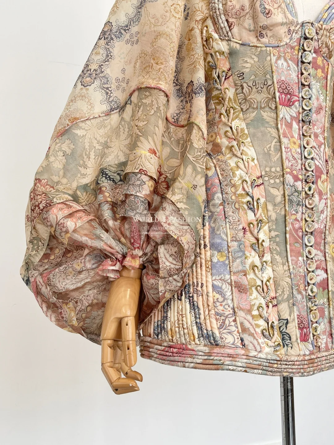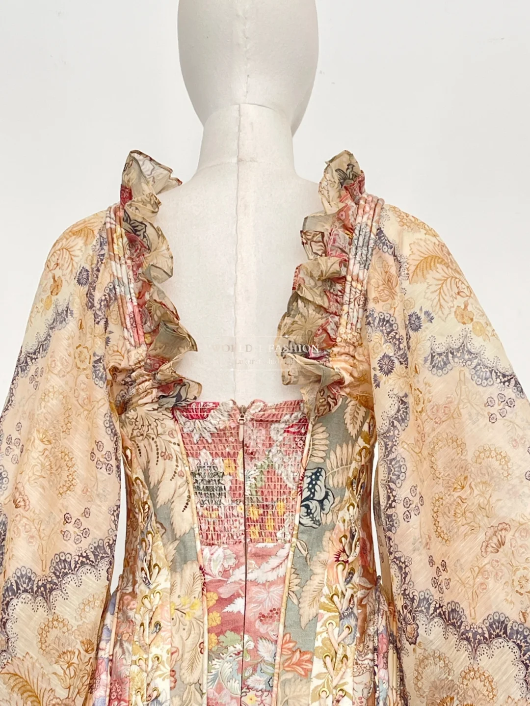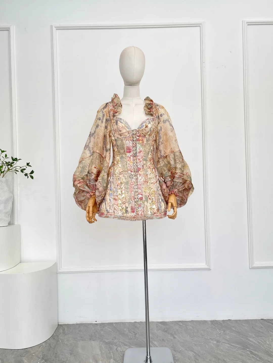 Women Dress 2026 Autumn New High Qaulity Floral Pink Brown Floral Print Long Lantern Sleeve Backless Mini Dresses
