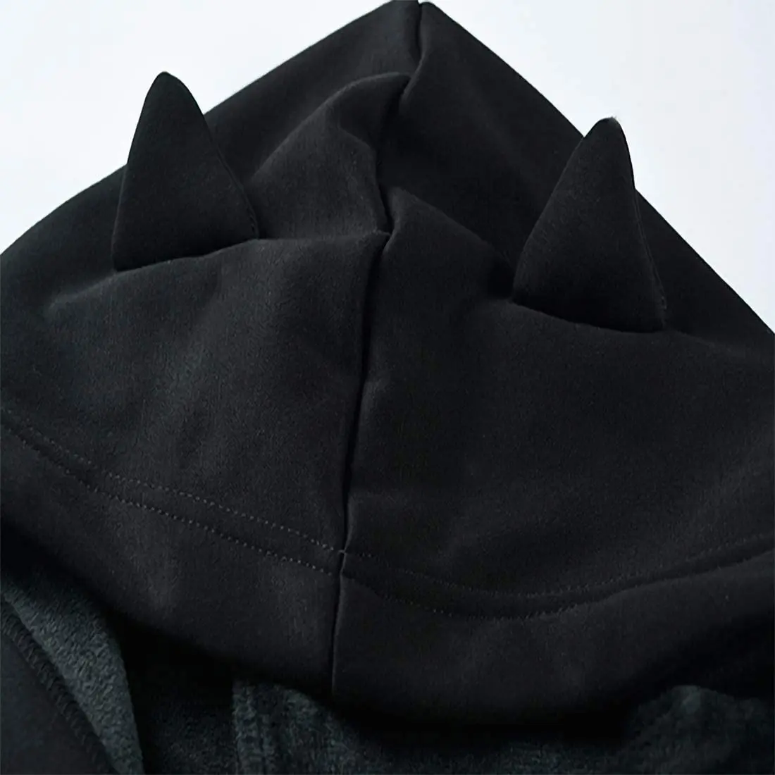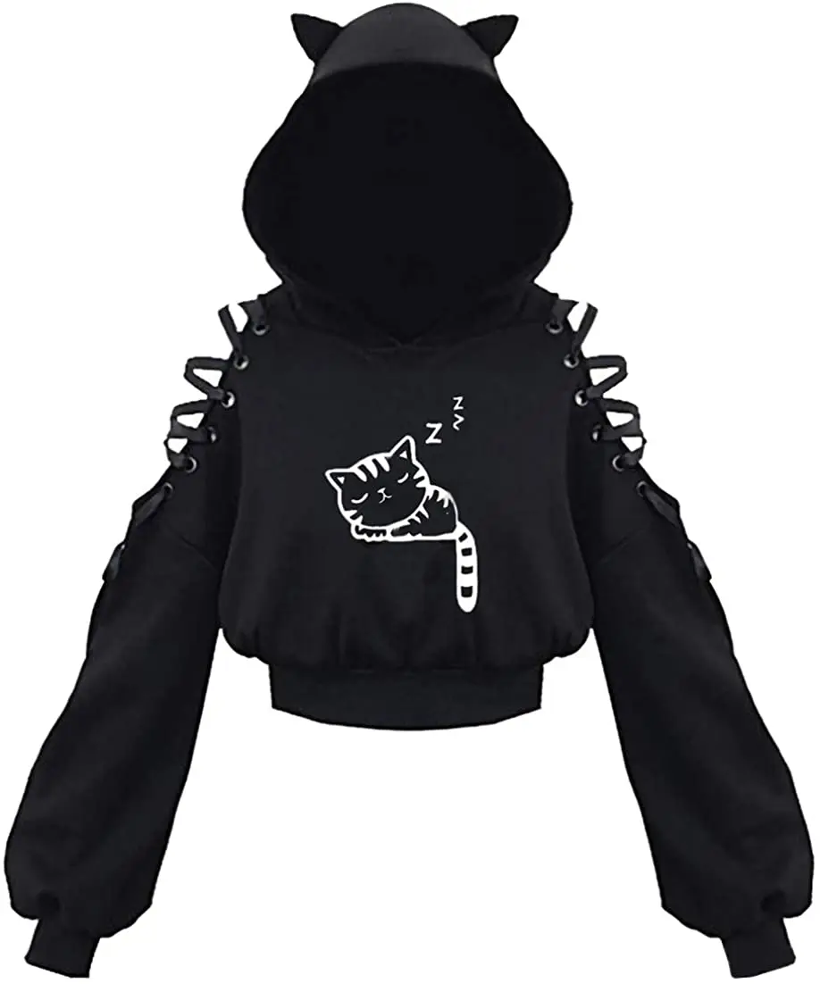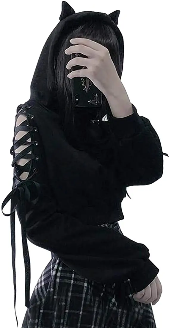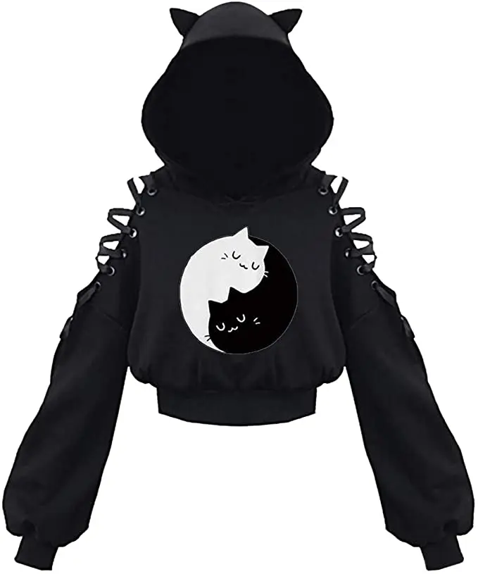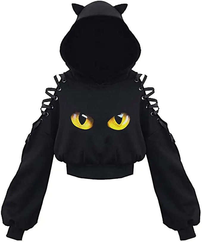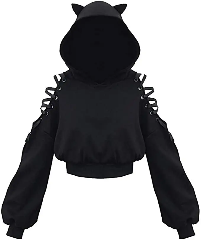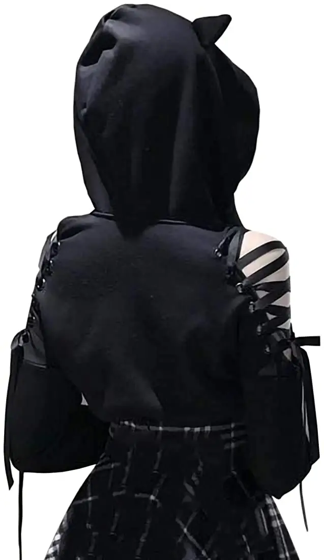 Women Long Sleeve Hoodies Kawaii Cat Ears Hoodie Gothic Punk Harajuku Cold Shouler Bandage Gothic Black Sweatshirts