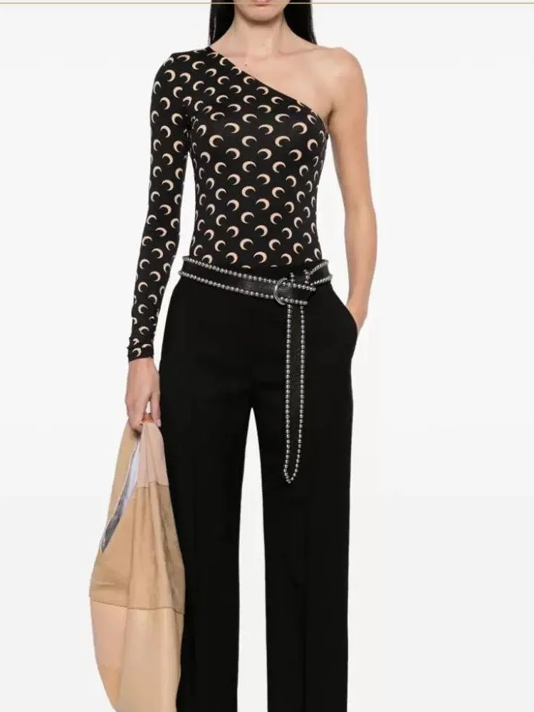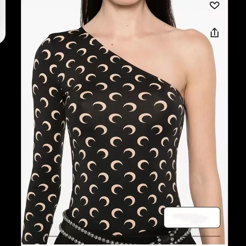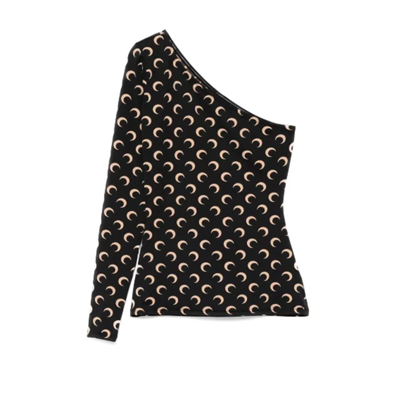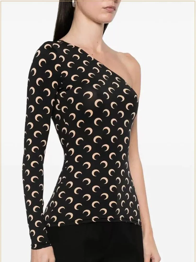 Women Tshirt Long Sleeve Korean High Street Casual Slim Fit Ice Silk Stretch Fabric Moon Print Slanted Collar Sunscreen Top