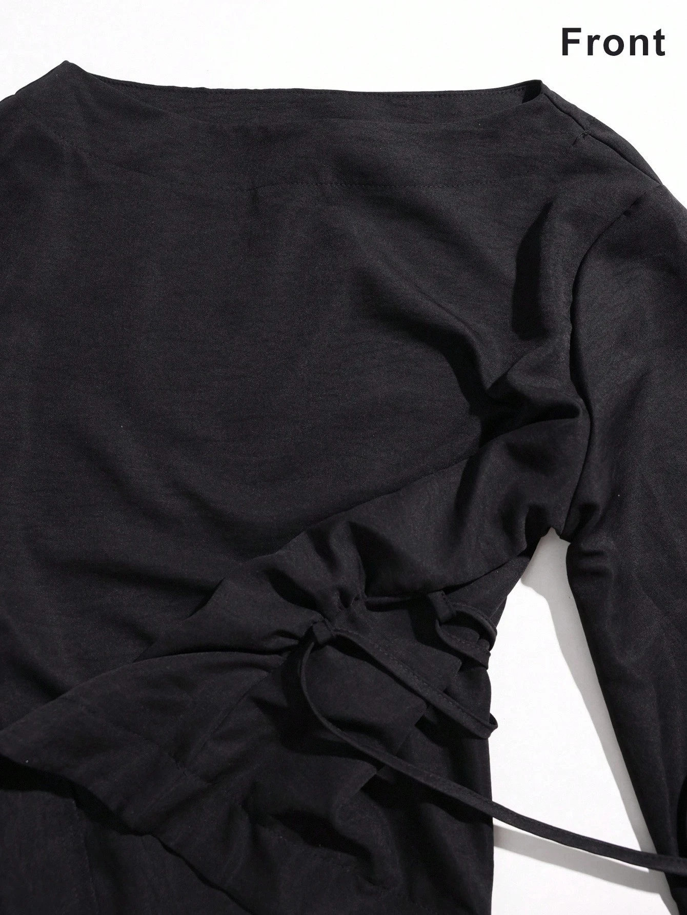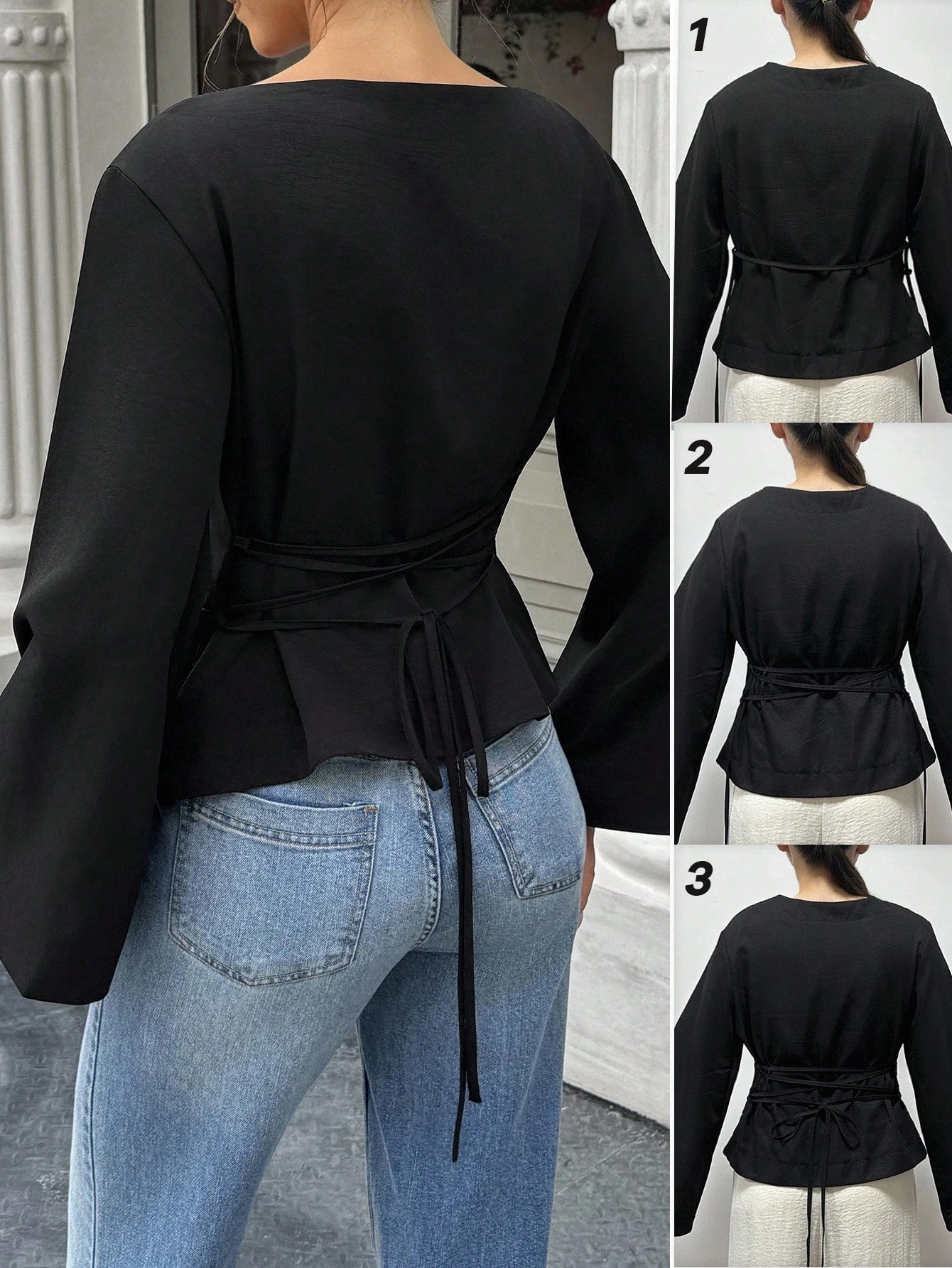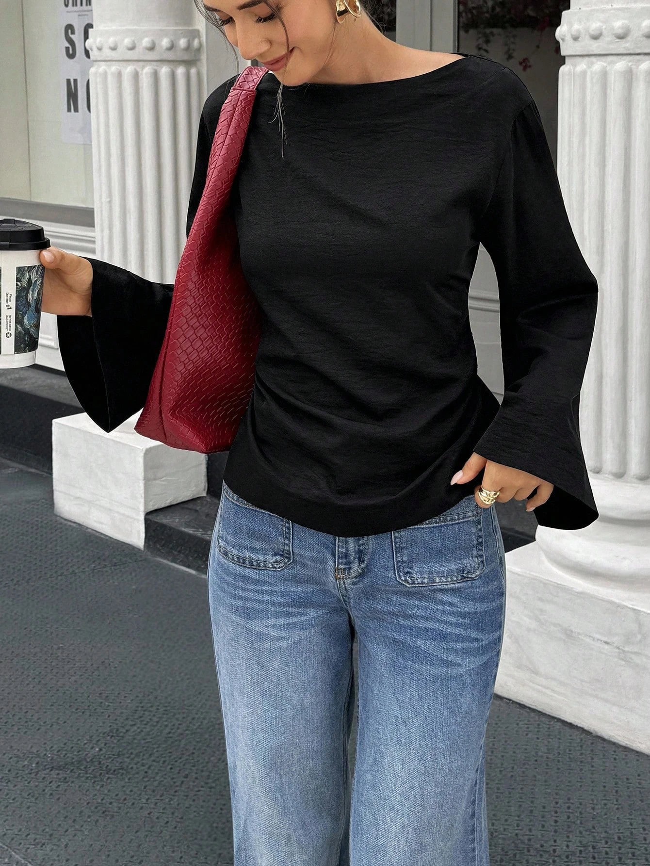Women's Casual Solid Color Boat Neck Flare Sleeve T-Shirt Elegant Back Tie Slim Fit Long Sleeve Tops Spring/Fall