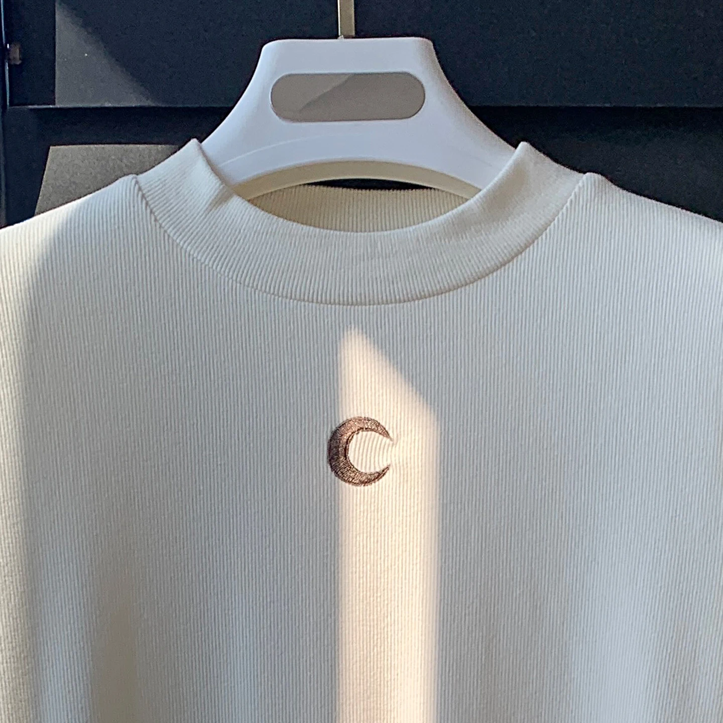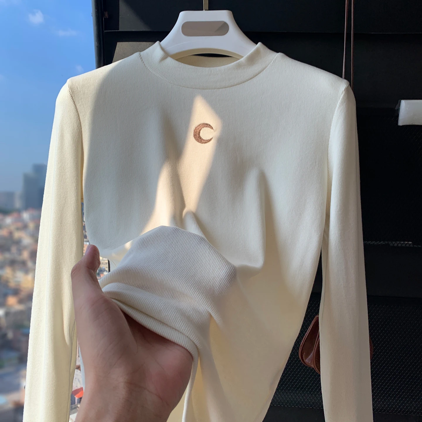 Women's Long Sleeve Tshirt Semi High Neck Moon Embroidery Casual Korean Fashion Base Top Solid Color Versatile Inner Spring New