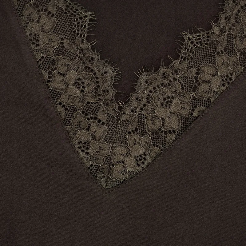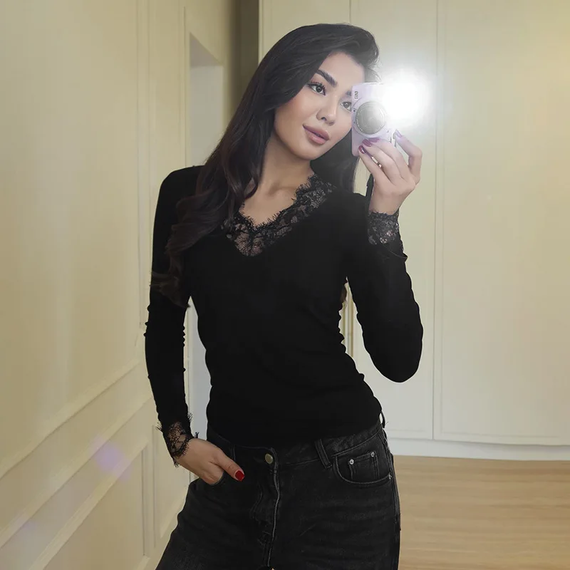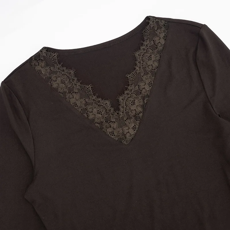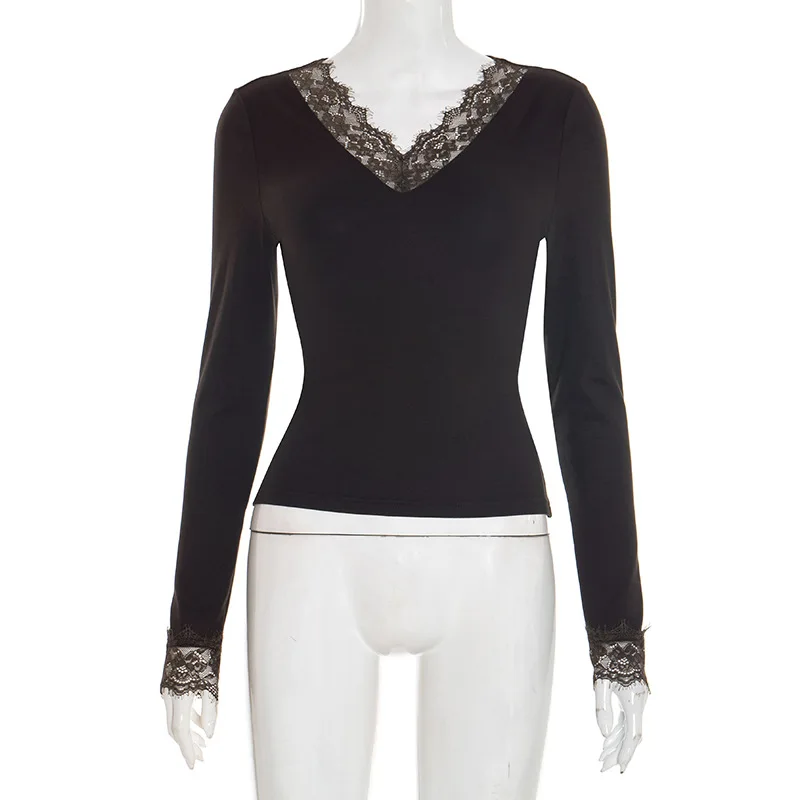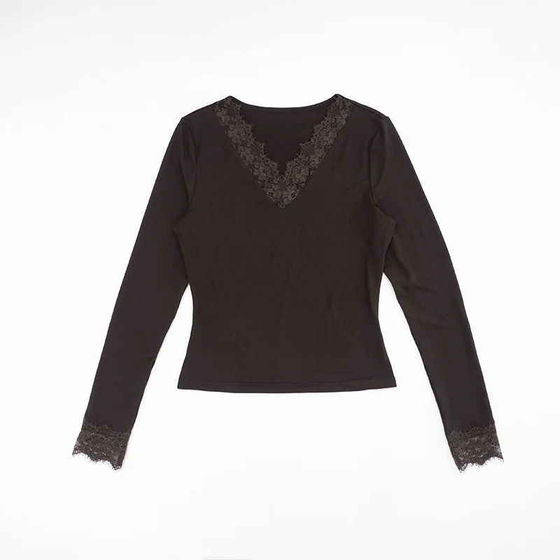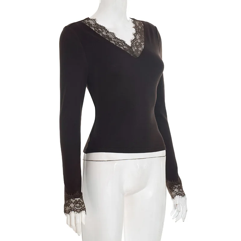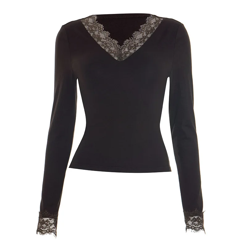 Women's V-neck Lace Splicing Top European American Style Autumn New Waist Exposed Umbilical Fashionable Casual Wear