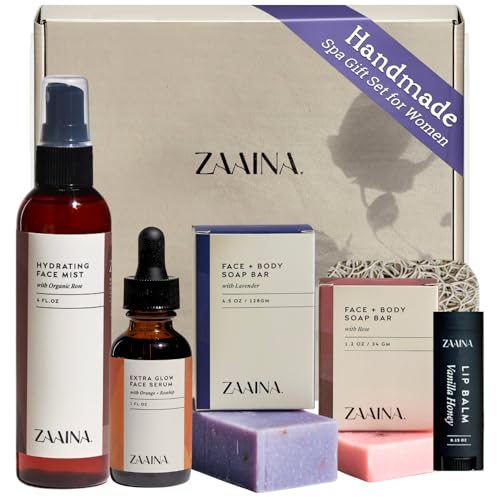 COMPLETE SPA GIFT SET: Indulge in a deluxe womens spa gift set with face mist, glow serum, lavender and rose soaps, and lip balm. Enjoy a relaxing self care ritual at home anytime.NATURAL INGREDIENTS FOR SKIN: Crafted with rosehip oil, vitamin E, shea butter, and botanicals. This skin care package for women is gentle on sensitive skin and perfect for daily use.LUXURY GIFT PACKAGING: Arrives in a beautiful box with decorative filler, making it a popular gift set for women. Ideal for birthdays, holidays, or as a thoughtful beauty gift hamper.AROMATHERAPY SCENTS INCLUDED: Features calming lavender, romantic rose, and uplifting lemongrass. Each product in this bath gift set for women relaxing offers a soothing sensory escape.HANDMADE AND UNIQUE: Handcrafted in small batches for quality. This organic bath set for women gift is a thoughtful woman relaxation gift spa set for anyone seeking natural gifts for women.